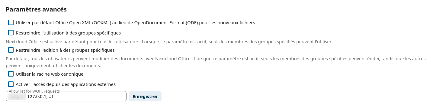 J’ai installé Nextcloud et Collabora online (le paquet YunoHost, pas built-in CODE, par contre ça s’affiche tout de même comme étant Collabora online development edition). Malgré les réglages des hôtes WOPI que j’ai faits je ne parviens pas à ouvrir un document