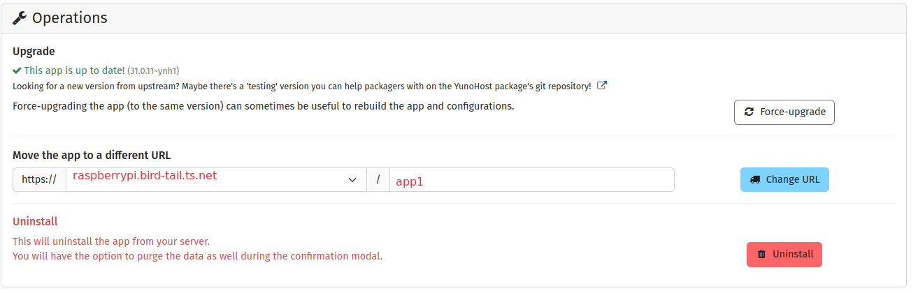 I am connecting to my Yunohost instalation in a home Rasperberry Pi using Tailstcale magicDNS (eg. “raspberrypI[DOT]bird-tail[DOT]ts[DOT]net”). I currenty have 2 apps installed in Yunohost (eg. “app1” and “app2”).