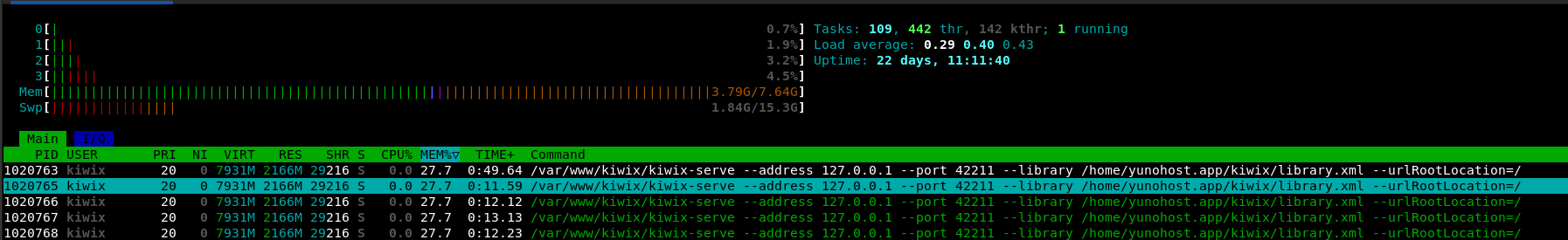 1020768 kiwix 20 0 7978M 2182M 29224 S 0.0 27.9 0:12.51 /var/www/kiwix/kiwix-serve --address 127.0.0.1 --port 42211 --library /home/yunohost.app/kiwix/library.xml --urlRootLocation=/