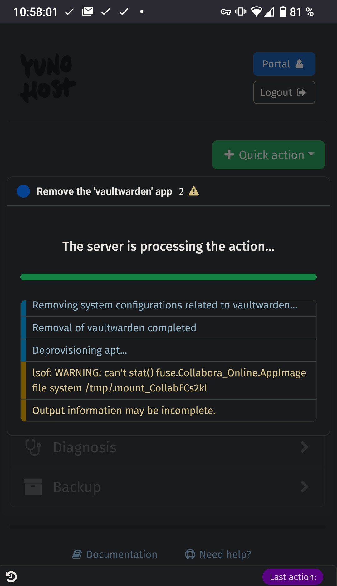 Hier soir j’ai décidé de sauvegarder mon coffre Vaultwarder puis de désinstaller et réinstaller l’application. J’ai lancé la désinstallation hier soir, si Vaultwarden n’est plus accessible (404), il n’est pas proprement désinstallé et j’ai toujours ce matin dans mon espace admin la popup “The server is processing the action”