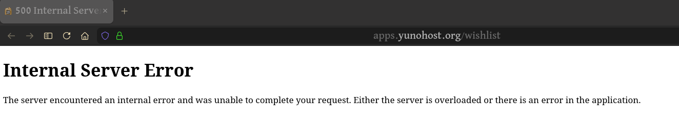 Are you in a special context or did you perform specific tweaking on your YunoHost instance ?: Internal Server Error “Apps Wishlist”