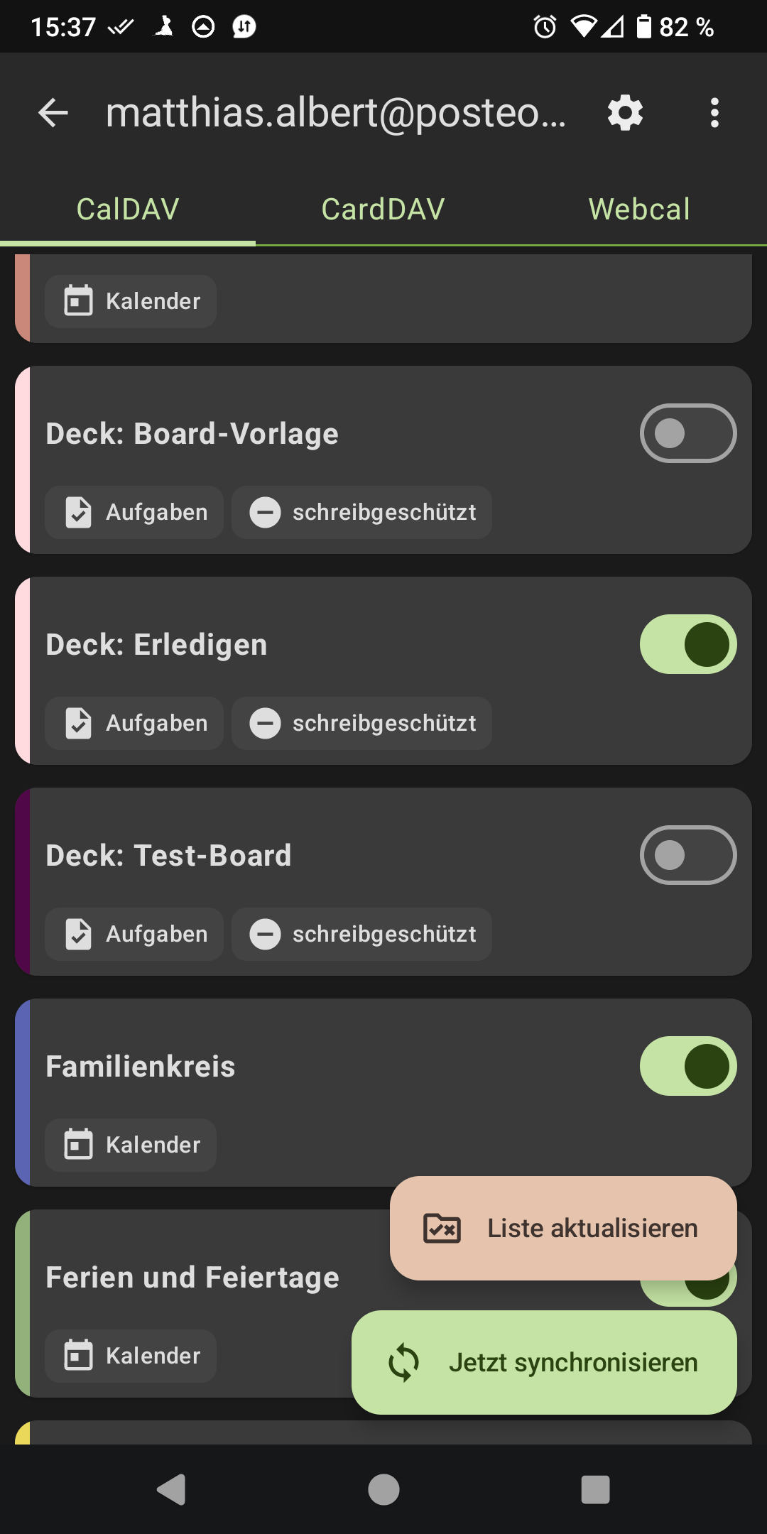 Screenshot of the Davx5 app on Android. Deck: Erledigen and Deck: Test-Board are the two boards listed as task categories. “schreibgeschützt” means “write-protected”, “Aufgaben” means “tasks”.