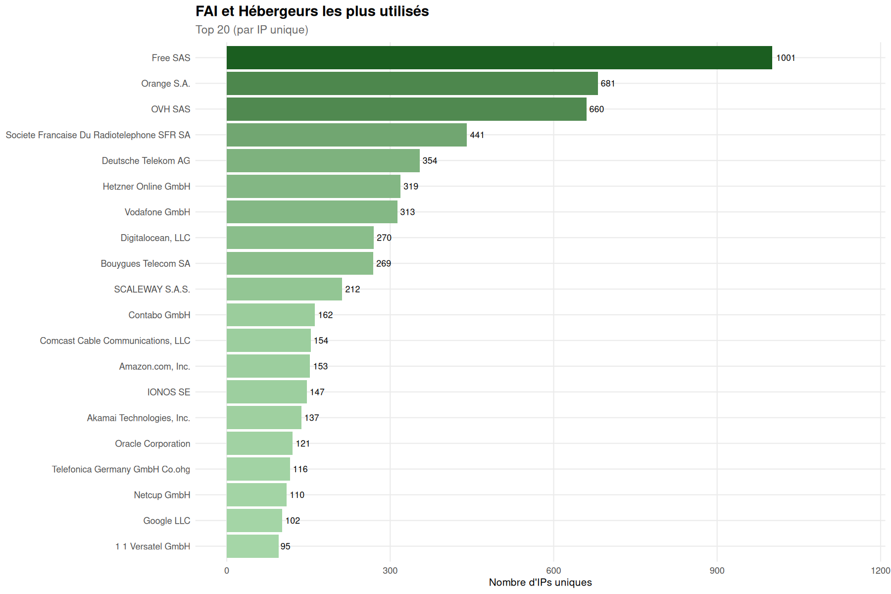 Observation : Les FAI résidentiels français (Free, Orange, SFR, Bouygues) représentent une part importante, ce qui suggère véritablement de l’auto-hébergement à domicile plutôt que sur des VPS.