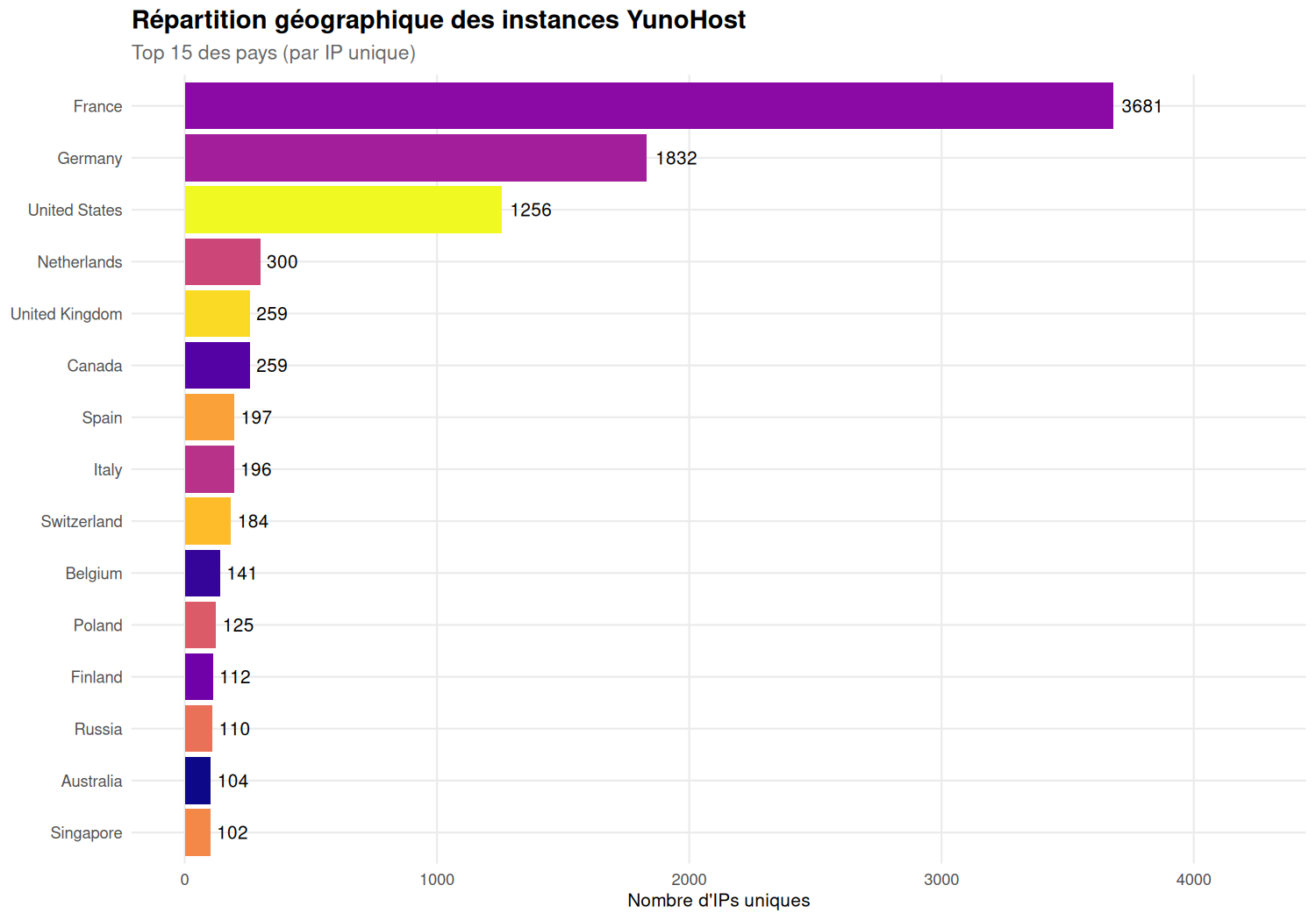 Observation : La France reste largement en tête (), ce qui est cohérent avec l’origine du projet YunoHost.