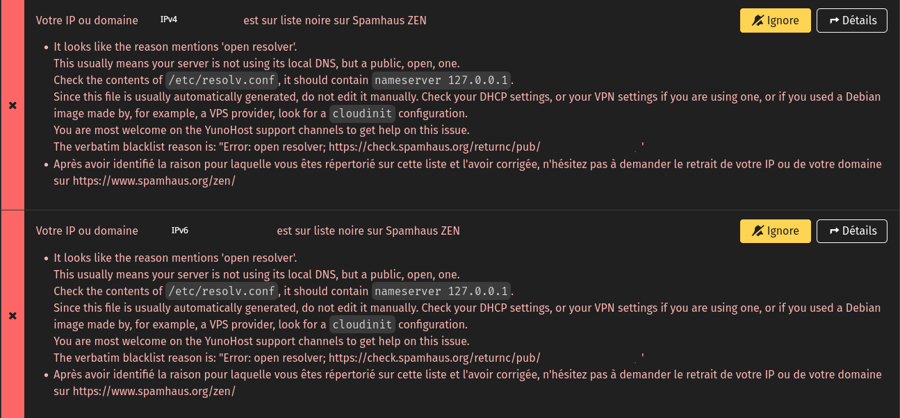 The update to YunoHost 12.1.32 (stable) the diagnosis says that I have a problem with Spamhaus ZEN.
