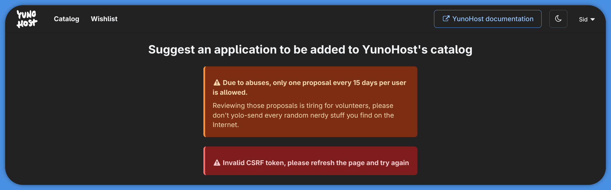 Adding apps to the wishlist is rate limited, because you know, we are humans not bots, so we can’t handle a lot of reviews besides searching for fixes for broken apps, adding new apps to the catalog, testing them, etc…