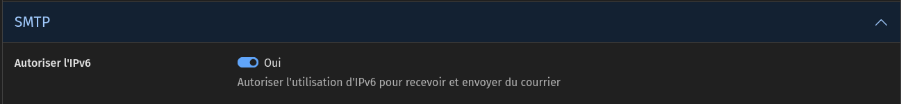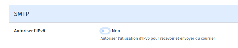 - Certains fournisseurs ne vous laisseront pas configurer votre DNS inversé (ou leur fonctionnalité pourrait être cassée…). Si votre DNS inversé est correctement configuré en IPv4, vous pouvez essayer de désactiver l'utilisation d'IPv6 lors de l'envoi d'emails en exécutant 'yunohost settings set email.smtp.smtp_allow_ipv6 -v off'. Remarque : cette dernière solution signifie que vous ne pourrez pas envoyer ou recevoir d'emails avec les quelques serveurs qui ont uniquement de l'IPv6.