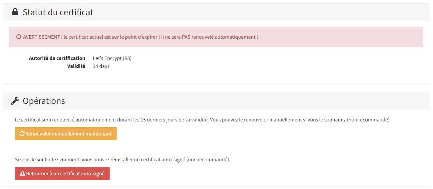 For non french readers it says “certificate is almost expired and will NOT renew itself automatically” and a few lines later “certificate is renewed automatically during the last 15 days of its validity”